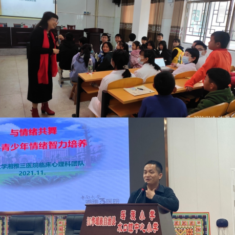 当日下午,心理健康帮扶团队唐秋萍教授、肖长根副教授等在江华县瑶族小学、江华县水口中学两所学校开展了青少年心理健康知识讲座。讲座主要针对留守儿童普遍存在的心理缺乏关爱、感情缺少寄托、社会支持较少等问题,以生动的语言、形象的图文向当地青年少年学生科普相关心理健康知识,提供应对情绪的相应对策,在互动中实现教学目标。