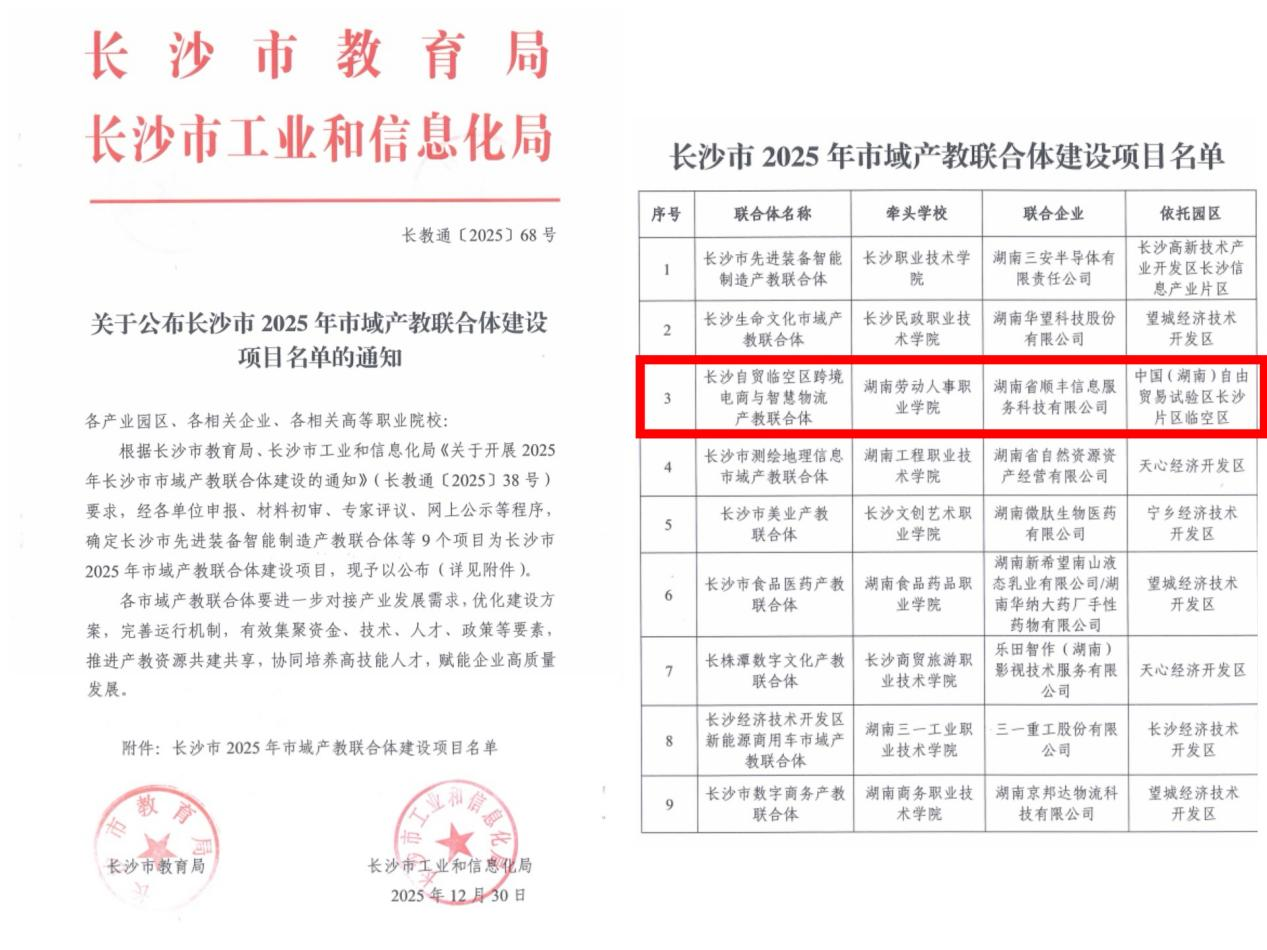 近日,从长沙市教育局、长沙市工业和信息化局传来喜讯:由湖南劳动人事职业学院牵头,依托中国(湖南)自由贸易试验区长沙片区临空区,联合湖南顺丰信息服务科技有限公司共同申报的“长沙自贸临空区跨境电商与智慧物流产教联合体”,成功入选“长沙市2025年市域产教联合体建设项目”名单。