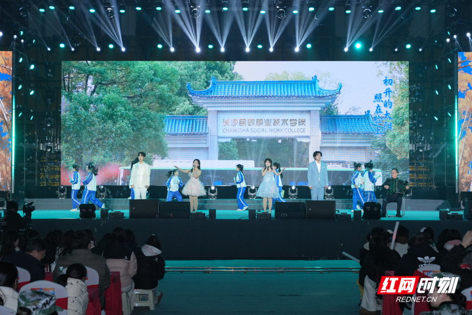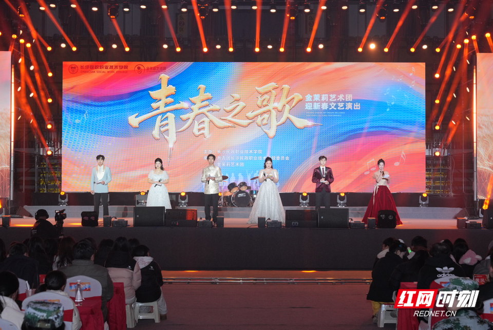 红网时刻新闻1月10日讯(记者 汪衡 通讯员 黎婕 吴辉翔)1月9日晚,长沙民政职业技术学院主办、共青团长沙民政职业技术学院委员会承办,金茉莉艺术团倾情呈现的《青春之歌》2026迎新春文艺汇演圆满举行。近五千人齐聚一堂,共赴这场光影交织、意蕴深远的青春艺术盛宴。