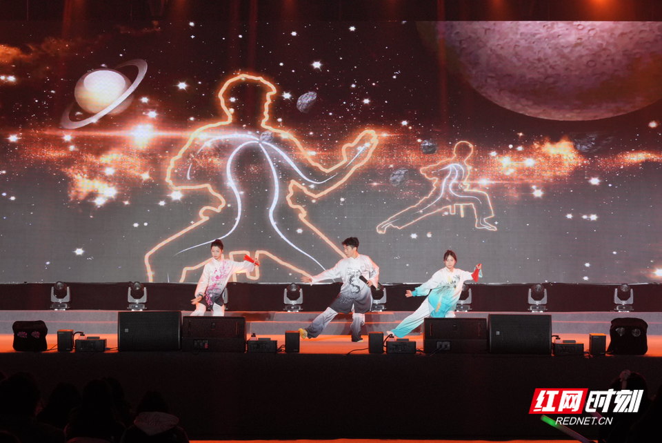 武术表演《男儿当自强》改编自古曲《将军令》,表演者们拳脚生风、动作铿锵,展现中华武术刚健之美,传递传承民族精神、勇于担当的豪情。
