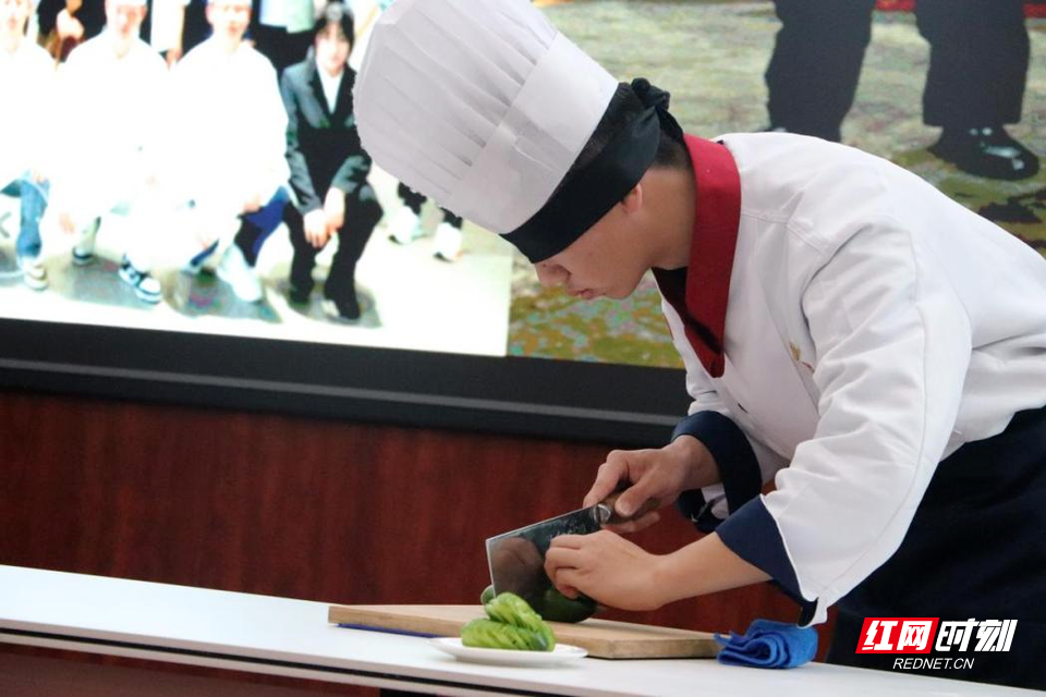 “团队之星”评选中,烹饪2435班余勋义进行刀工技能展示。