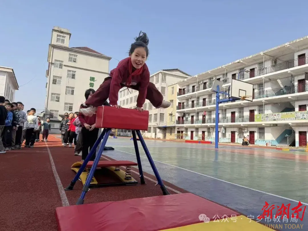 清晨七点,太阳刚爬上宁乡喻家坳中心小学的屋檐,塑胶跑道上已经热闹起来。鞍马旁,体育老师弯着腰,双手轻轻护在两侧。“子轩,看准踏板,别犹豫!”六年级的子轩深吸一口气,助跑、踏跳、双手一撑——身影在空中轻巧地分开,又稳稳落地。周围顿时响起一片清脆的掌声……