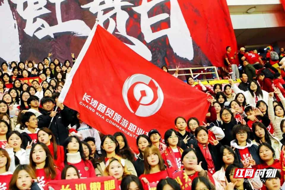 “热血燃胸膛,战鼓阵阵惊雷响……”湘超半决赛长沙对阵永州的现场,由数百名商贸学子组成的助威方阵摇旗呐喊,看台上席卷过一阵阵红色声浪。