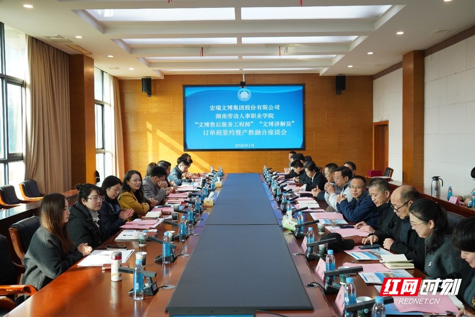 红网时刻新闻1月7日讯(记者 任晔 通讯员 侯俊)1月6日上午,湖南劳动人事职业学院与宏瑞文博集团股份有限公司在学院视频会议室举行“文博售后服务工程师”“文博讲解员”订单班签约仪式暨产教融合座谈会。学院党委副书记、院长钟秋明,宏瑞文博集团董事长徐武洪等校企双方代表共同出席,围绕深化人才培养合作、创新产教融合模式、共育文博行业高素质人才等议题展开深入交流,达成广泛共识。