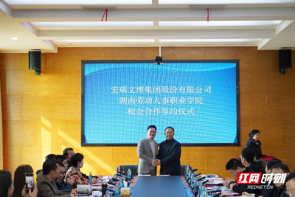 湖南劳动人事职业学院与宏瑞文博集团股份有限公司举行校企合作签约仪式。
