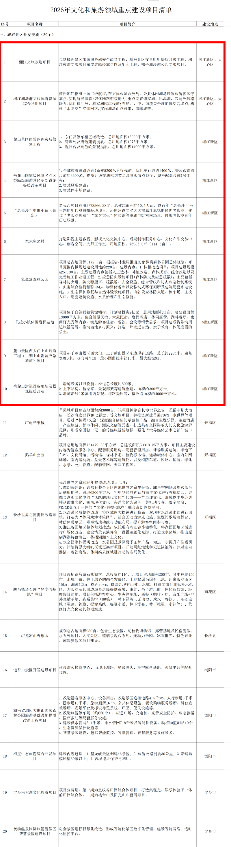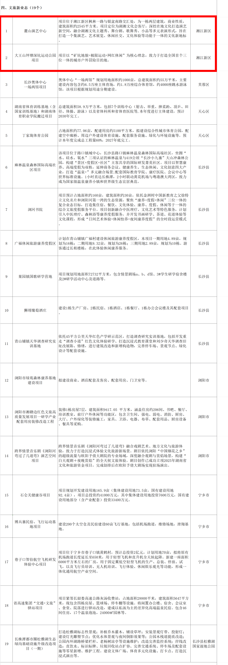 其中,湖南湘江新区将铺排湘江洲岛群文旅体育资源综合利用项目、艺术家之村、汉长沙国文旅片区开发建设项目、大王山坪塘深坑运动公园项目等18个文旅重点建设项目。