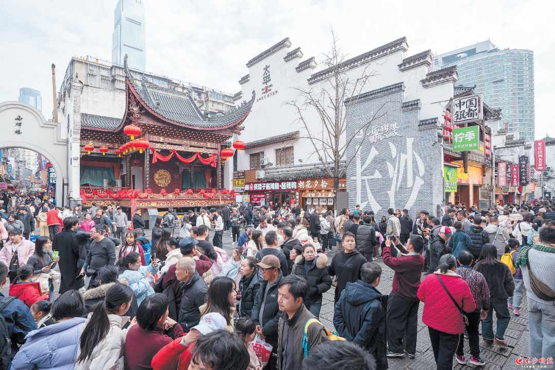 丰富多彩的活动也激发了商圈的活力。在黄兴南路步行商业街,游客摩肩接踵,周边的奶茶店、臭豆腐店等门口排起长队,边走边品尝美食的游客络绎不绝。在长沙国金中心、万象城、海信广场等商业中心,多家餐厅高朋满座,为春节增添了浓浓的烟火气。