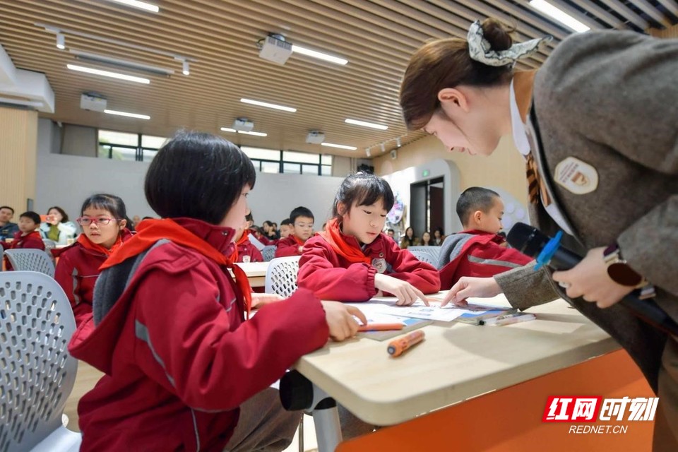 长沙市天心区仰天湖实验学校红领巾讲解员正在为出席活动的领导嘉宾介绍学校办学特色“智慧美育”。