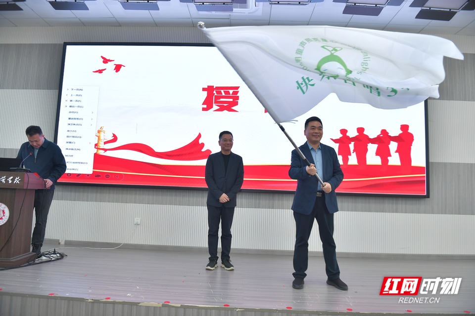 湖南师范大学教授、博士生导师,北京德清公益基金会理事郭声健代表项目组为沅江授旗。