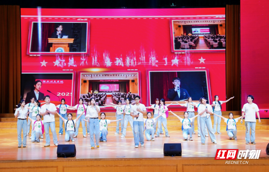 大会在湖南信息学院合唱团演唱的《绒花》中开场。校院两级团委学生会学生骨干演绎青春励志歌曲《我的未来不是梦》。
