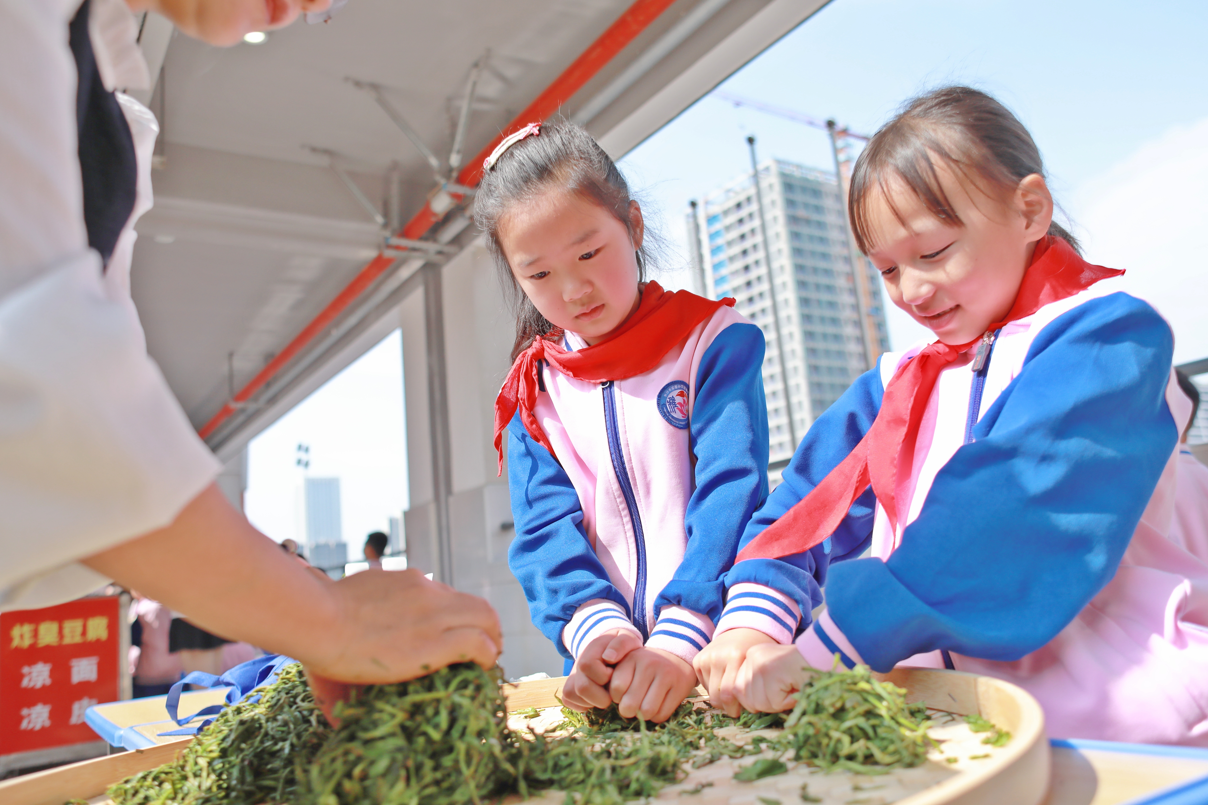 学生们正在炒茶区体验。