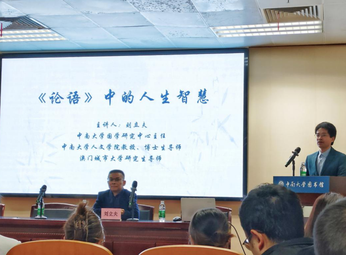 当人工智能能代笔论文、绘制海报、破解难题,却无法回应“为何而做”“该做什么”的深层思考,两千多年前的《论语》能否为当代青年点亮人生航向?4月22 日,一场以“《论语》中的人生智慧”为主题的讲座在中南大学潇湘校区图书馆精彩开讲。本次活动由中南大学图书馆、校团委、国家语言文字推广基地(中南大学)、人文学院联合主办,特邀人文学院教授、博士生导师、国学研究中心主任刘立夫教授担任主讲,中南大学人文学院教授、博士生导师徐陶主持,与全校师生共探AI时代的为人之道,让经典智慧在现代校园绽放新的思想光芒。听众济济一堂,来自校内外师生160余人参加本次讲座。