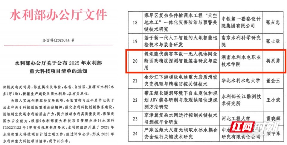 红网时刻新闻4月2日讯(记者 汪衡 通讯员 欧阳进武)近日,水利部2025年重大科技项目立项结果公布,共立项100个项目。由湖南水利水电职业技术学院牵头申报的《堤坝隐伏病害车载—无人机协同全断面高精度探测智能装备研发与应用》项目成功获批立项,是全国职业院校中唯一、全省本年度唯一立项的重大水利科技项目,标志着该校在水利工程智能巡检领域的科技创新能力和协同攻关水平迈上新台阶。