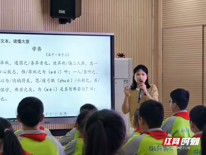 在课例展示环节,湖南师大附中双语教育集团语文名师吴佳敏老师带领六(3)班同学,执教《学弈》。她立足小初语文课标衔接点,以初中高阶思维要求反哺小学高段文言教学,从解析“之”的多重指代用法入手,在字斟句酌的文辞品读中夯实文言基础,通过梳理文意、对比两位学弈者的学习态度,在循循善诱的思辨探究中培养逻辑能力,在古今对话的课堂互动中涵养语文素养,为小初文言文教学的梯度衔接搭建了可操作、可迁移的实践框架。