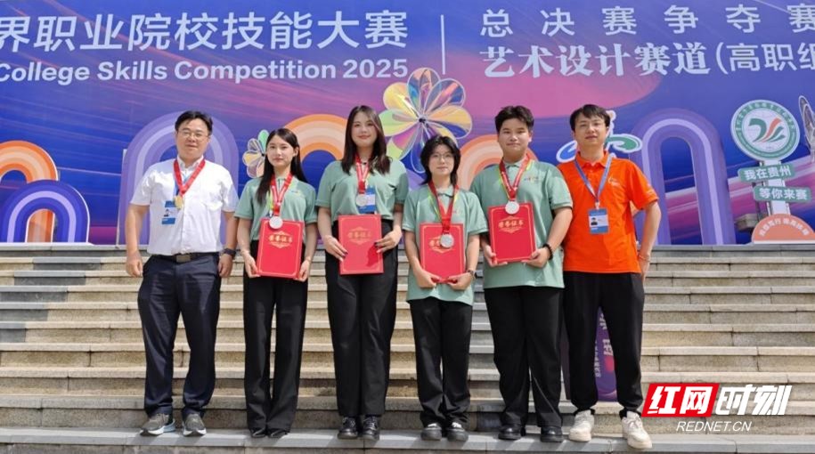 近日,2025届世界职业院校技能大赛传来捷报,湖南大众传媒职业技术学院陈希文老师带领周天雅、蒋瑾、胡佐橙、张梓妍四名学生组成的参赛团队,凭借扎实的专业技能与创新的设计理念,斩获国家级银奖,为学校赢得荣誉的同时,也展现了新时代职业教育中师德师风与技能培养深度融合的育人成果。这是陈希文带领学生团队获得的第13个省级以上竞赛奖项。