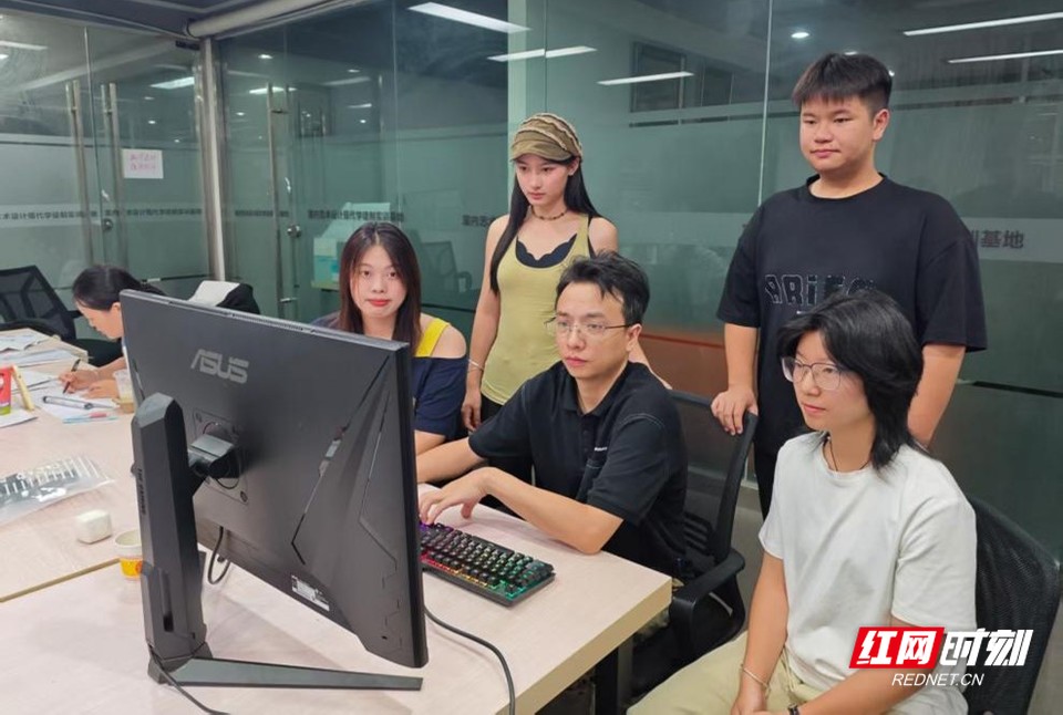 “作为优秀的设计师,专业硬实力、文化软实力和职业态度缺一不可。”这是陈希文在备赛期间常对学生说的话。为夯实团队的基本技能,他放弃休息时间,制定了“理论+实践”双轨备赛计划:白天带领学生梳理数字化展厅设计的核心知识点,从空间布局的合理性到数字内容的适配性,逐一拆解难点;夜晚则陪着学生在工作室反复打磨作品,针对模型渲染、交互逻辑等细节问题,手把手指导修改,常常忙到深夜。