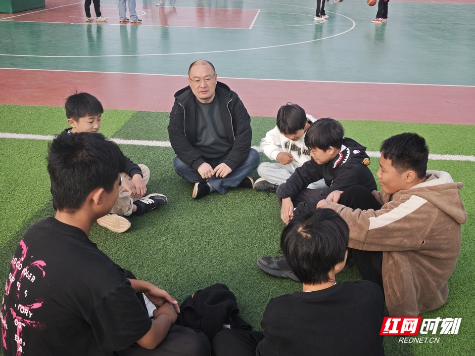 邵阳市隆回县三阁司镇长铺初级中学曾振老师在操场上跟学生交流谈心。