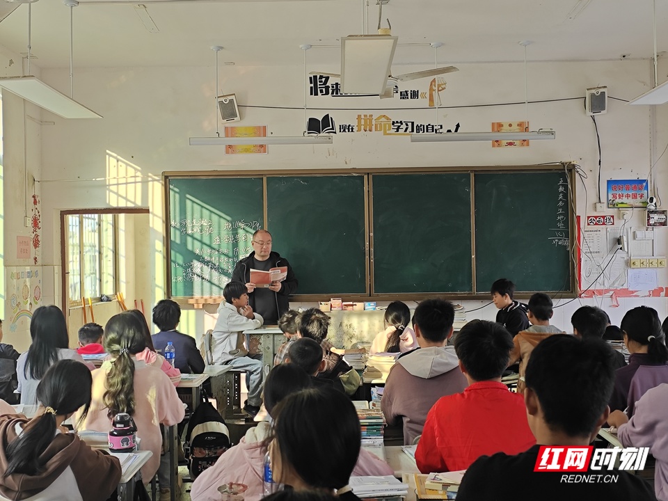 邵阳市隆回县三阁司镇长铺初级中学曾振老师正在给学生上课。