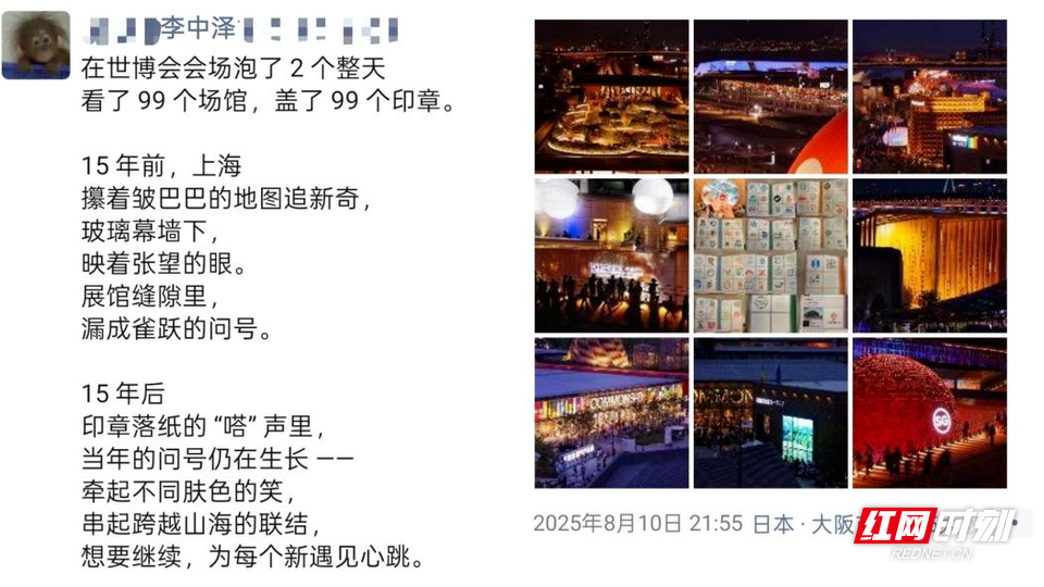 今年8月的世博会之行,对他而言更是一场跨越15年的“情怀之旅”。2010年上海世博会时,父亲带他逛展的经历在他心中埋下探索世界的种子。“今年泡在展馆两天逛了90多个馆,仿佛重新握住了当年探索世界的钥匙,找回了对世界纯粹的好奇。”