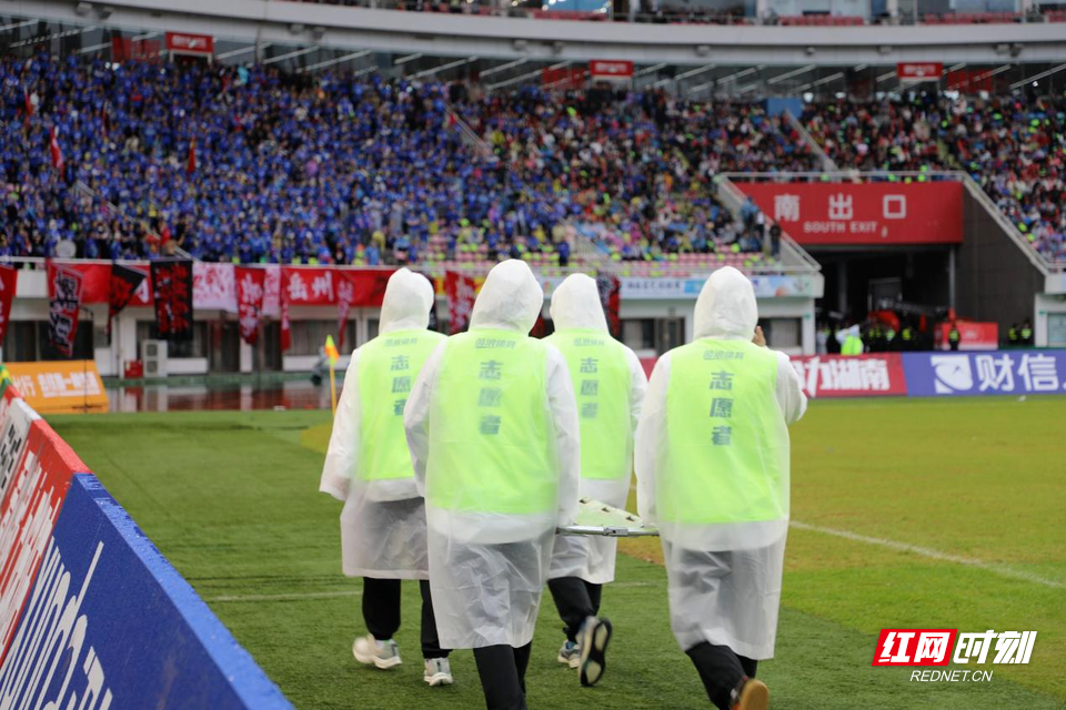 红网时刻新闻11月10日讯(记者 任晔 通讯员 黄雨春 吴智昊 实习生 周子怡)11月8日,2025年湖南省足球联赛第九轮,长沙队对战岳阳队。比赛现场,淅沥雨声与观众呐喊声交织,长沙商贸旅游职业技术学院33名青年志愿者化身“雨中守护者”,以热忱坚守与专业服务为赛事筑牢保障,成为赛场边最亮眼的青春风景。